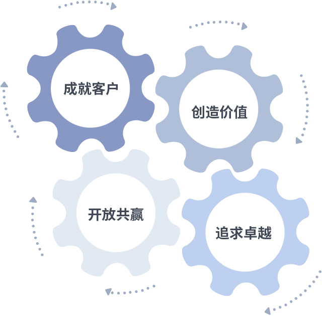 成就客户是一切决策的出发点,,创造价值是衡量所有工作的标准,,追求卓越是我们做事做人的态度,,,开放共赢是我们的格局也是最终的结果。。。价值观的齿轮环环相扣,,,推动着组织里的每个人不断向前。。